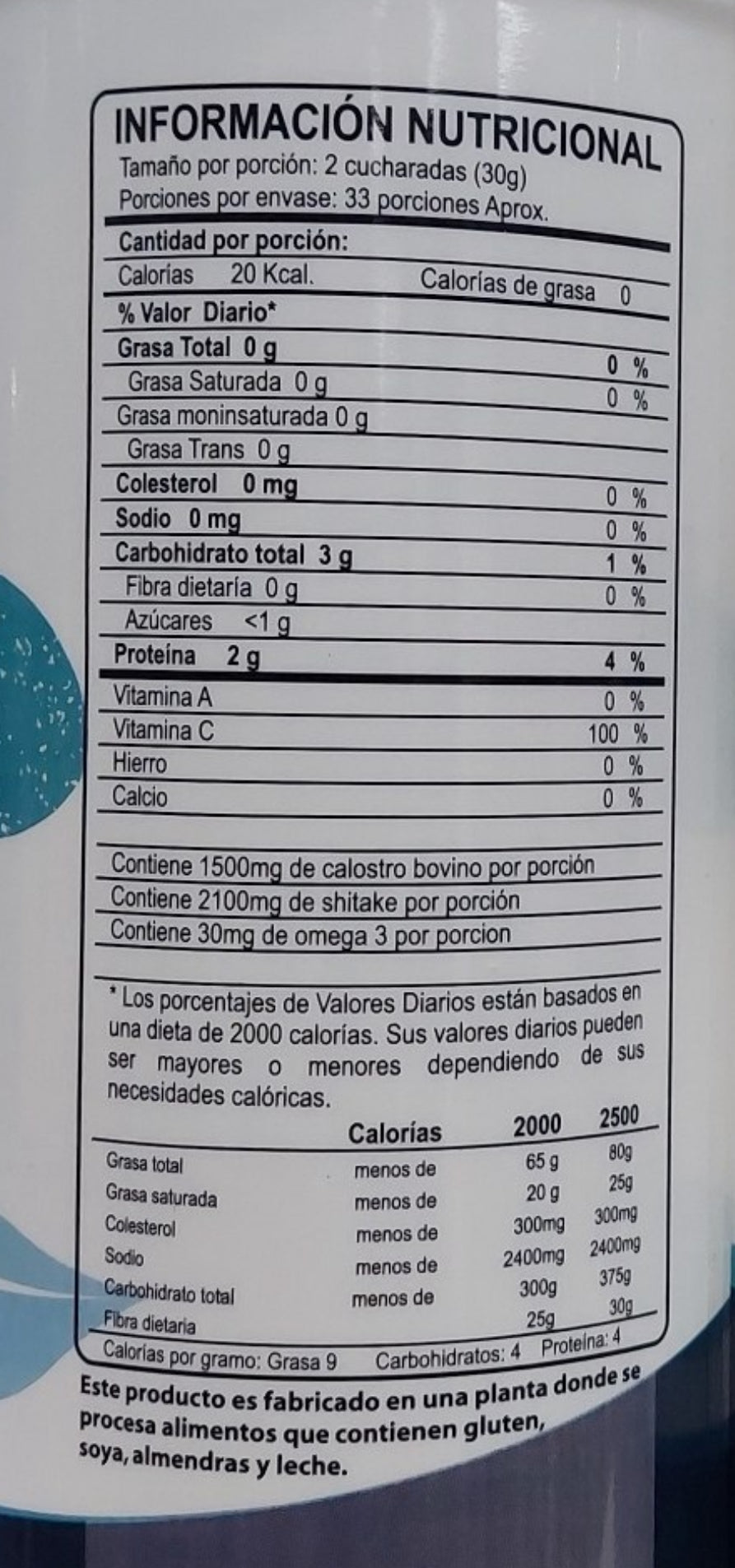 El Bio-Fac-Tor con Calostro de Impro Natural es un alimento en polvo formulado con una mezcla única de ingredientes naturales que fortalecen el sistema inmunológico y aportan energía diaria. Su combinación de calostro, hongo shiitake, vitamina C y omega 3 lo convierte en un suplemento ideal para toda la familia.