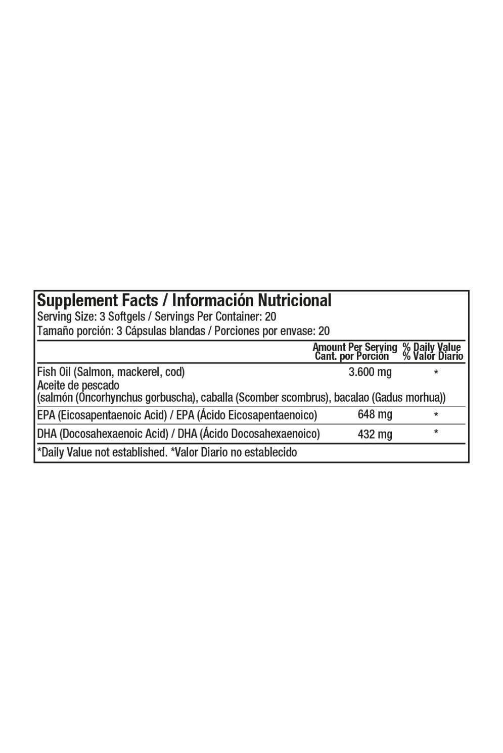 Los Omega-3 son ácidos grasos esenciales que el cuerpo no produce por sí mismo y que cumplen un papel vital en la salud del corazón, el cerebro y las articulaciones. Este suplemento de Fish Oil 1200 mg aporta 360 mg de ácidos grasos Omega-3 por porción, en prácticos softgels fáciles de tomar y de alta pureza.